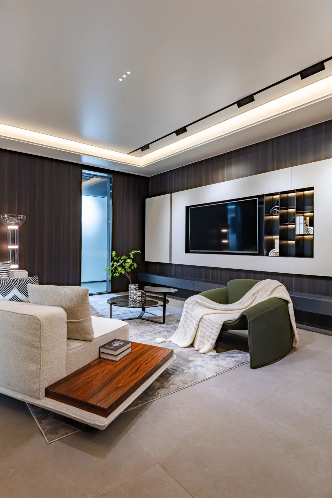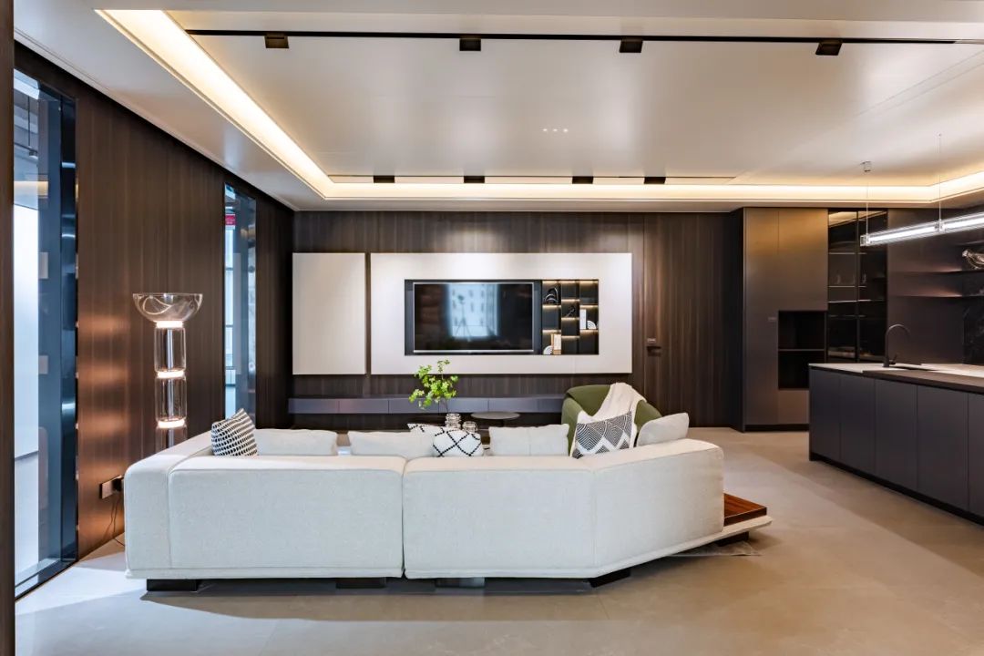 客廳給聚會(huì)的(de)親友(yǒu)營造輕松歡聚的(de)空(kōng)間(jiān)環境,懸浮式的(de)大(dà)✘闆吊頂,空(kōng)間(jiān)層次感強,開(kāi)燈後錯(cuò)落有(yǒu)緻,極具氛圍感。