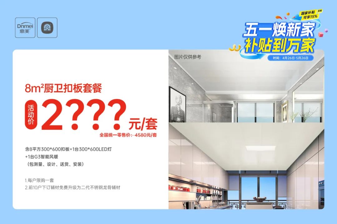 本次五一(yī)活動,鼎美(měi)針對(duì)廚衛空(kōng)間(jiān),推出5大(dà)套餐,不(bù)同¥吊頂與電(diàn)器(qì)的(de)組合方式,滿足不(bù)同家(jiā)裝需求,無論是(shì)新房(fáng)÷裝修還(hái)是(shì)廚衛舊(jiù)改,都(dōu)能(néng)讓您選到(dào)心儀的(de)方£案。