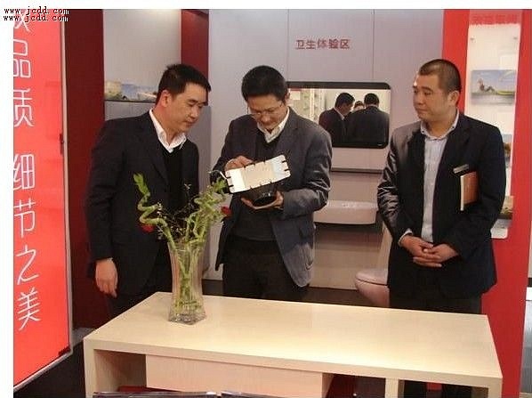 徐建役部長(cháng)(中)在總經理(lǐ)張轲(左一(yī))及副總經理(lǐ)陳雲峰(右一(yī))γ的(de)陪同下(xià)參觀鼎美(měi)展廳,對(duì)鼎美(měi)的(de)動力換氣系統贊賞有(yǒu)加!