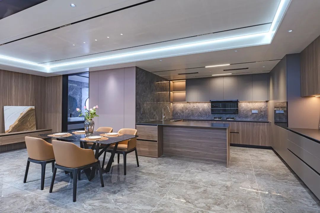整間(jiān)廚房(fáng)選用(yòng)深胡桃木(mù)紋色搭配太空(kōng)灰,在暖色光(guāπng)源的(de)烘托下(xià),顯得(de)溫馨且不(bù)失高(gāo)級質感。