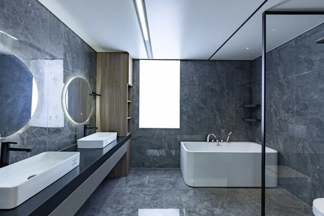 衛生(shēng)間(jiān)牆面選用(yòng)高(gāo)光(guāng)生(shēng)态木(mù)♦實芯牆闆,頂面搭配無膠大(dà)闆和(hé)線型取暖,采用(yòng)幹濕分(fēn)區(qū)和(hé)無主燈設計(jì),簡約時(shí)尚。