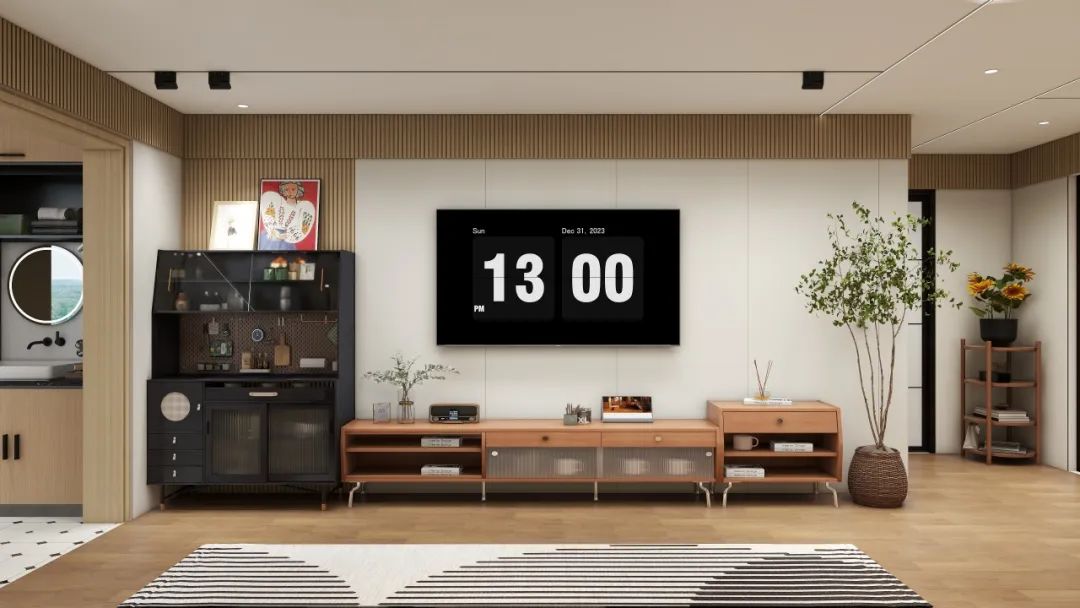 輔以原木(mù)電(diàn)視(shì)櫃、北(běi)歐實木(mù)收納櫃、編織藤花(huā)盆