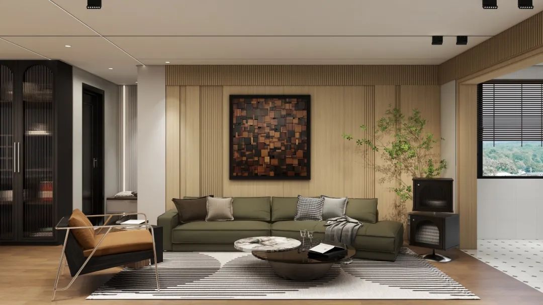 搭配極具抽象感的(de)挂畫(huà)、複古綠(lǜ)沙發、綠(lǜ)植