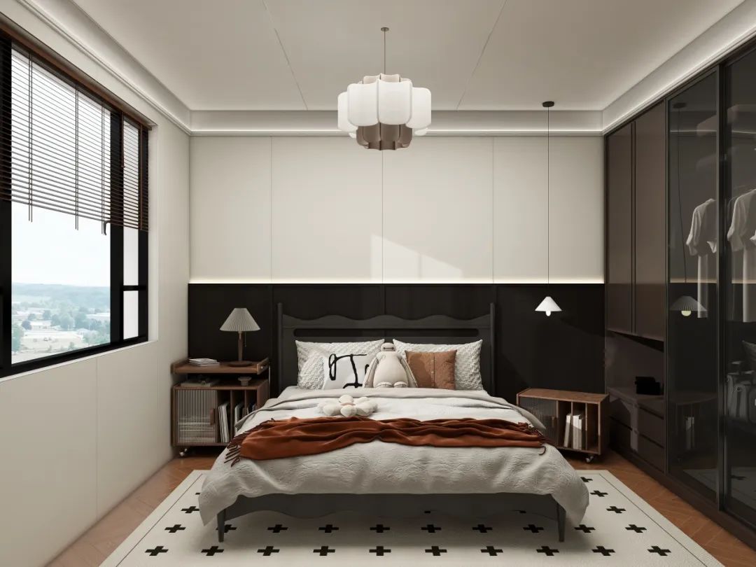 采用(yòng)頂面無膠大(dà)闆-寶玑白(bái),牆面原香木(mù)-真石漆(米色)+原香木(mù)-煙(yān)熏橡 木(mù),鋁木(mù)複合衣櫃,搭配北(běi)歐床頭櫃,地(dì)毯,吊燈并輔以燈帶線條,給人(r£én)一(yī)種高(gāo)級的(de)複古美(měi)感。