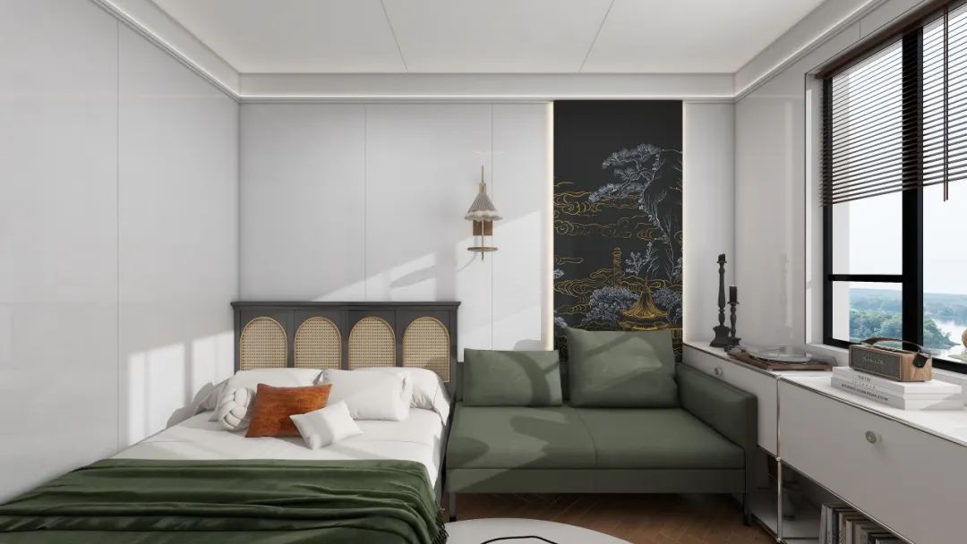 采用(yòng)頂面無膠大(dà)闆-寶玑白(bái),牆面原香木(mù)-真石漆(米色)+原香木(mù)-定制(zhì✔)噴繪,搭配橄榄綠(lǜ)雙人(rén)沙發,模塊邊櫃,地(dì)毯,複古床頭燈,将思想、空(kōng)間(jiān)、物(wù)件(j iàn)還(hái)原為(wèi)簡單形式,心憩于形,入夢枕間(jiān),怡然恬靜(jìng)。