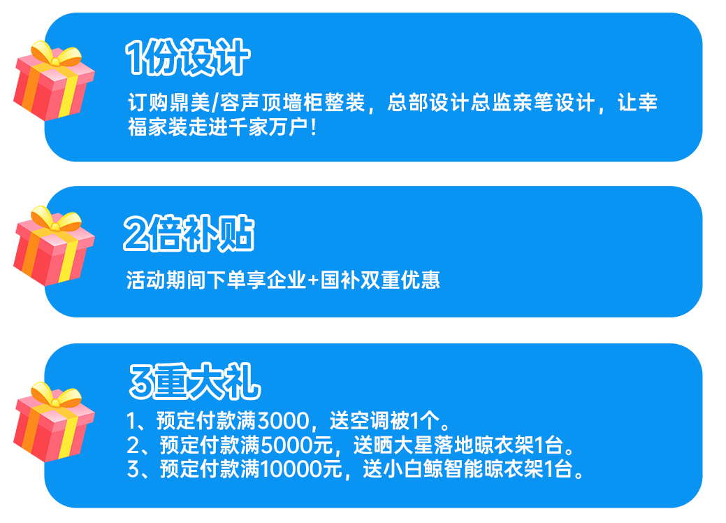 活動期間(jiān),凡在鼎美(měi)全國(guó)終端門(mén)店(diàn)訂購(gòu)即可(kě)享:1份設計(jì)+2倍補貼+3重大(dà)禮,誠意滿滿,期待您的(dπe)光(guāng)臨!